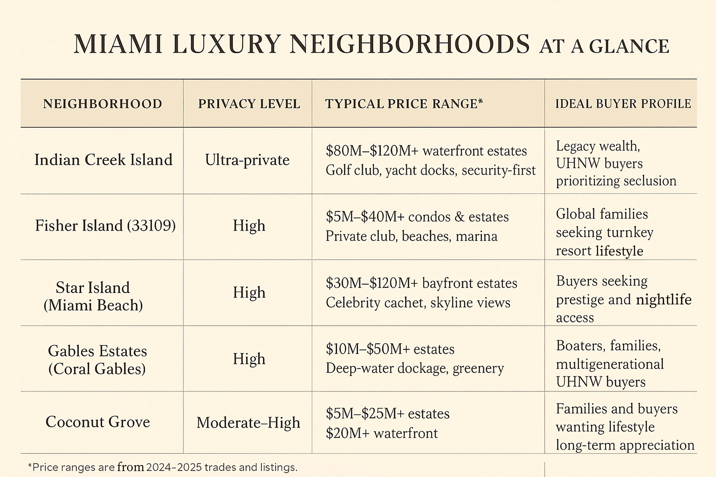 Why it stands out: Coconut Grove is Miami’s oldest neighborhood, blending lush canopy streets, waterfront estates and proximity to top schools and cultural hubs. Known for its bohemian spirit, luxury inventory includes bayfront mansions and gated communities like The Moorings, Hughes Cove and Entrada Estates. Signals of strength: The Grove has seen record per-square-foot trades above $20M+ for waterfront estates, and its family appeal plus limited inventory are pushing sustained appreciation. Recent redevelopment along the bay and inlet (Regatta Harbour + Grove Central) adds value for UHNW buyers seeking both lifestyle and upside. Buyer fit: Families and long-term buyers prioritizing elite schools, walkability, marinas, all-around great local dining options and historic prestige. Navigate: Some enclaves are gated with limited turnover; best opportunities often emerge off-market.